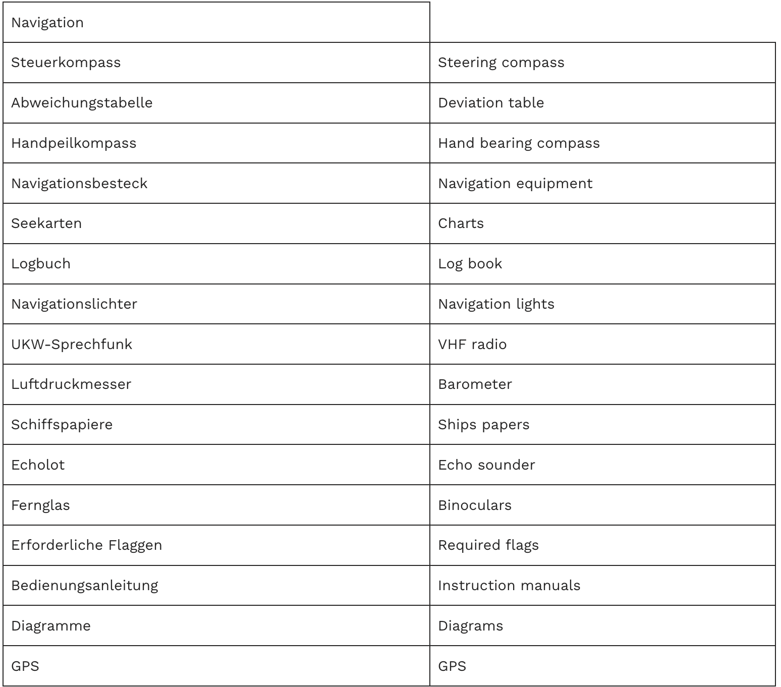 - Ort des Bordhandbuchs, der Seekarten und notwendigen Tabellen
