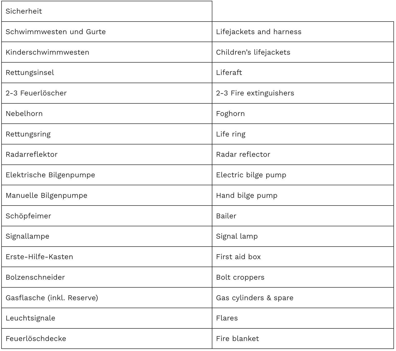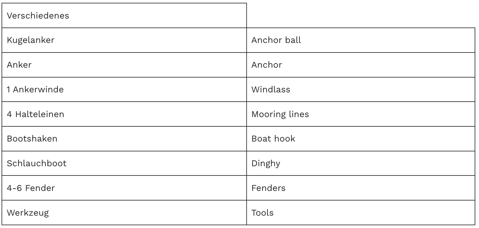 Fragen Sie beim Charterunternehmen gezielt nach, welche Ausrüstung standardmäßig an Bord ist und welche Sie bei Bedarf kostenpflichtig dazu buchen müssen. Es gibt keine internationalen einheitlichen Ausrüstungsvorschriften für Boote. Daher kann die vorhandene Ausrüstung von Boot zu Boot abweichen. Welche Ausrüstung im Idealfall an Bord gehört, können Sie der folgenden Übersicht entnehmen: